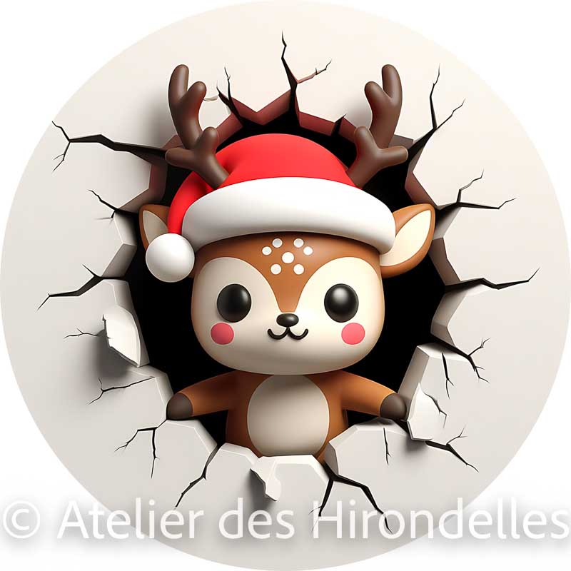 Sortez des décorations traditionnelles avec notre collection d’ornements en effet 3D bluffant. Ce petit renne craquant semble littéralement traverser la matière pour venir s’inviter dans votre salon ! Avec ses grands yeux expressifs et son petit bonnet rouge, il fera fondre le cœur des petits comme des grands. Mais d’autres personnages se sont invités à la fête, faites votre choix parmi les dessins proposés.