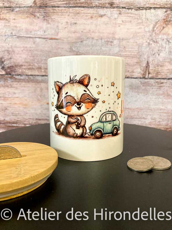 Notre raton laveur était tellement pressé de prendre le volant qu’il s’est garé un peu trop haut sur la tirelire ! Les couleurs sont aussi plus foncées (on dirait qu’il conduit de nuit). C’est le compagnon idéal pour quelqu’un qui veut passer son permis avec style et un brin d’originalité.