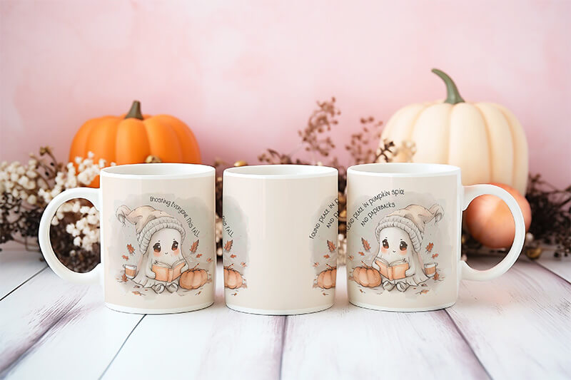 • Personnage Craquant : Le motif principal met en scène un adorable petit fantôme, coiffé d’un bonnet en tricotdouillet, qui est plongé dans la lecture d’un livre. Il est entouré de petites citrouilles et de feuilles d’automne.