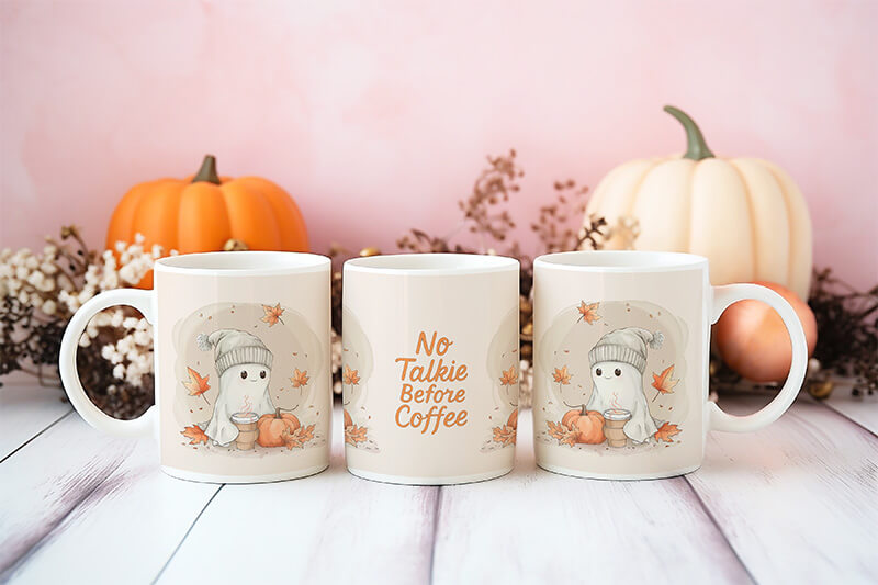 - Fantôme Adorable : Le motif présente un petit fantôme incroyablement mignon, coiffé d’un bonnet en tricotdouillet, et tenant sa propre tasse de boisson chaude (sans doute un latté de citrouille !).