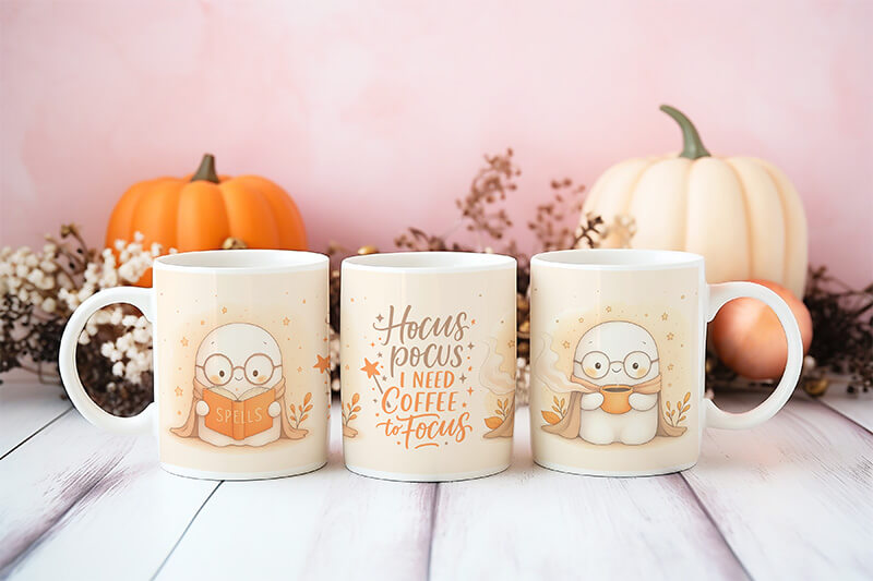 • Fantôme Lecteur Douillet : Le motif met en vedette un adorable petit fantôme enveloppé dans un plaid douillet. Sur une face, il lit un livre intitulé « Spells » (sortilèges) ; sur l’autre, il savoure sa boisson chaude enveloppé dans sa couverture.